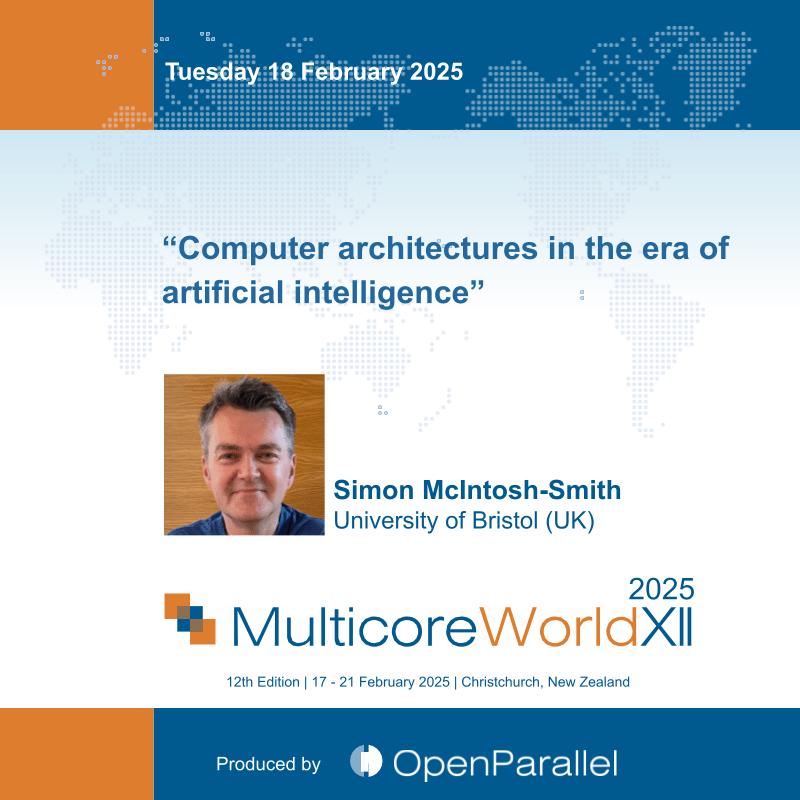 Professor Simon McIntosh-Smith is the founder and Director of the Bristol Centre for Supercomputing, which runs the UK’s Isambard-AI service. He began his career in industry as a microprocessor architect, first at Inmos and STMicro in the 1990s, before co-designing the world’s first fully programmable GPU at Pixelfusion in 1999. In 2002 he co-founded ClearSpeed Technology where, as Director of Architecture and Applications, he co-developed the first modern many-core HPC accelerators. He previously founded the HPC Research Group in Bristol, where his research interests include advanced computer architectures and performance portability.